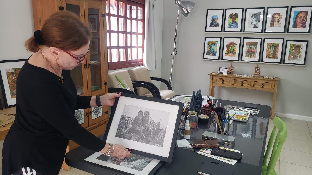 No acesso ao seu atelier chama atenção uma tela vazia num tripé com pincéis que, segundo ela , representa a retomada. “Em qualquer momento da vida podemos reescrever ou contar a história de outra forma. As vezes uma porta se fecha mas outras se abrem”, comenta ao explicar o motivo de uma tela vazia no acesso ao seu atelier que pode ser visitado segundas , quartas e sextas pela tarde. Pretende em 2025 fazer uma exposição inédita na cidade.